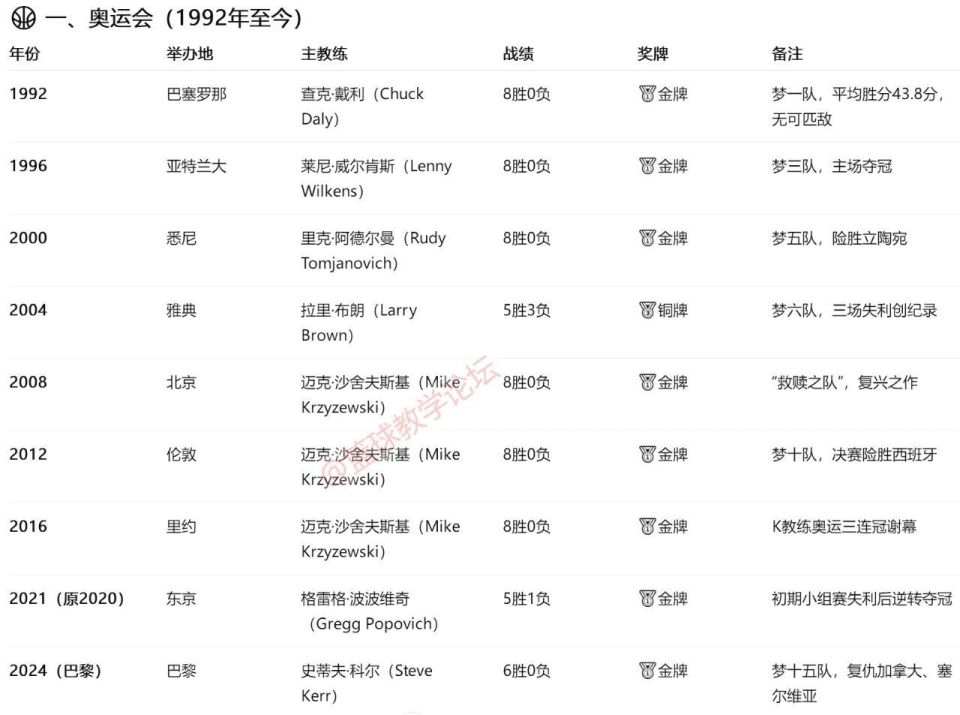 教主做了两个表格:自1992年至今,美国男篮历届奥运会和世界杯的主教练。老K教练无疑是最大赢家,率领美国男篮夺得三届奥运会金牌和两届篮球世界杯金牌。唯一的失利是2006年男篮世界杯,半决赛不敌希腊,最终夺得第三名。